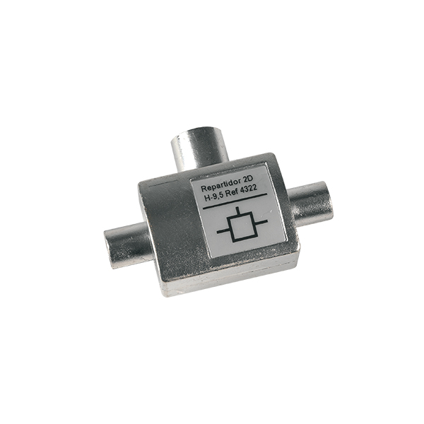 Repartidor inductivo de 2 direcciones y conectores CEI, para señales de TV. Posee un conector hembra y los otros macho. Instalación interior, típicamente en tomas o TVs.