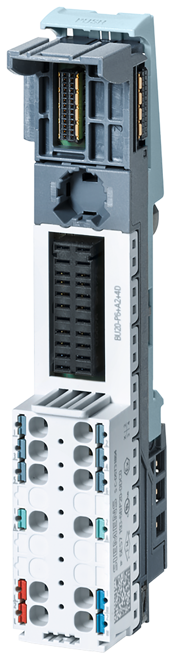 SIMATIC ET 200, BaseUnit BU20-P6+A2+4D para ET 200SP, BaseUnit tipo C0, bornes PUSH-IN de inserción directa, con 2 bornes auxiliares, nuevo grupo de carga, ancho por alto: 20mm x 117mm